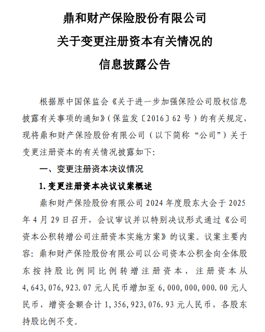 此次增资中,鼎和财险采用的资本公积金转增注册资本这一方式,在保险业并不多见。
